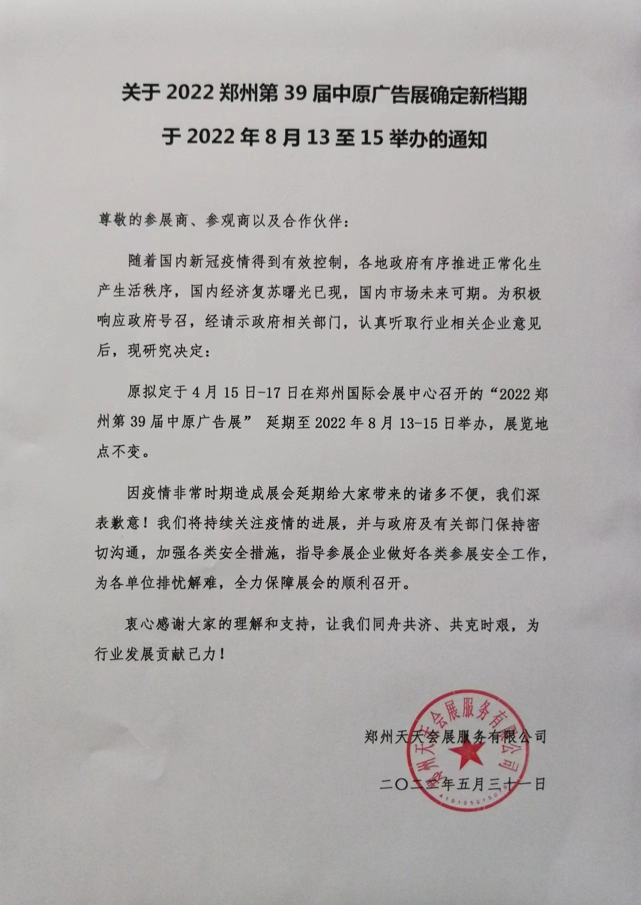 根據(jù)近期國內(nèi)新冠肺炎疫情形勢,為積極響應(yīng)國家疫情防控工作的要求,充分保障參展商、參觀商以及合作伙伴的切身利益與健康安全,鄭州天天會展服務(wù)有限公司將原定于今年4月15 -17日舉辦的2022鄭州第39屆中原廣告展延期至8月13 -15日進行,展會原定場地不變。