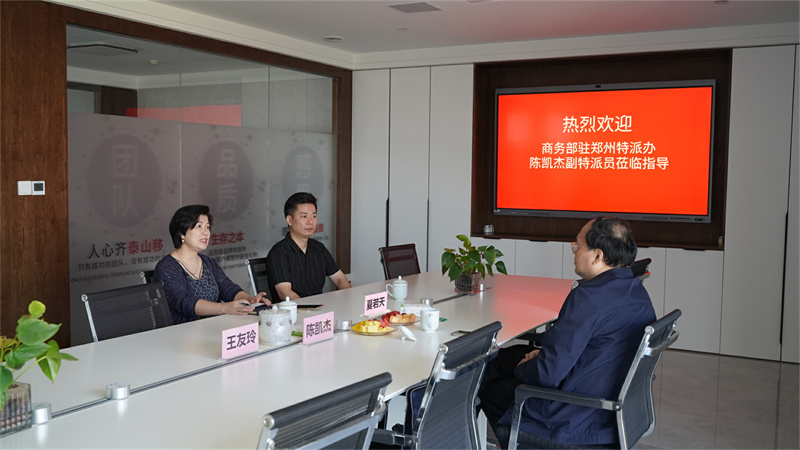 2022年9月29日上午,商務(wù)部駐鄭州特派員辦事處副特派員陳凱杰蒞臨鄭州天天會展服務(wù)有限公司(以下簡稱:天天公司)調(diào)研指導(dǎo)工作,天天公司董事長王友玲,副董事長夏若天進行了接待。